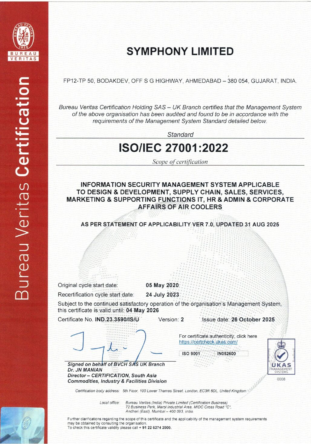 Symphony has been conferred with ISO9001:2015 certification affirming its commitment to excellence in quality.