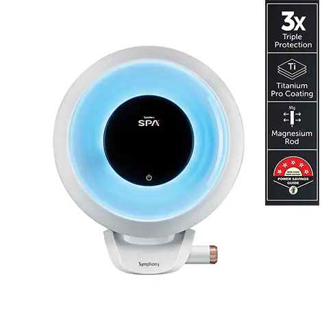 Symphony Spa Geysers are designed for those who prioritize hair health along with a luxurious hot water experience. Equipped with the 9-layer Advanced PuroPod filtration cartridge, this geyser neutralizes harmful minerals and softens water to reduce hair damage and dryness. It comes with a smart bath controller, allowing users to adjust temperature settings for a personalized experience. The heavy-duty heating element ensures fast heating, while the PUF insulation retains hot water for extended periods.